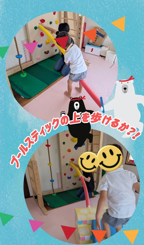 お友だちは、マットで幅はありますが、床から浮いている橋を作り、プールスティックでは継ぎ足歩行をしないと渡れない、幅の狭い橋を作りました!