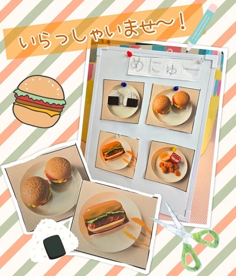 今日は運筆やはさみの練習も兼ねて「お店のメニュー看板を作ってみない?」と職員が提案すると、「やる!」と言ってもらえました🎶