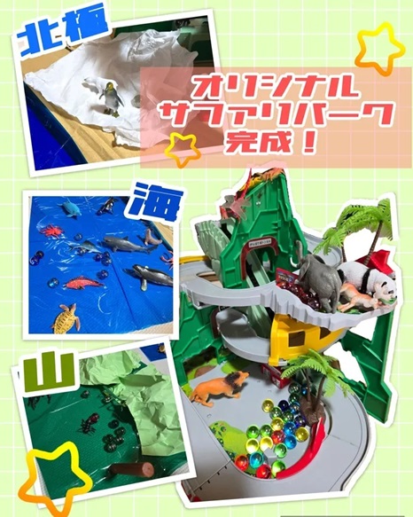 「ライオンはここ…」「キリンは…」と場所を決めて慎重に置いて行きます🤏サファリパーク完成!と思いきや、「これは……」と考え込むおともだち。