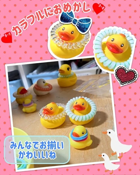今日のおともだちは、課題で使ったアヒルフィギュアをおめかしすることにしたようです👀🌟スプリングヘアゴムをアヒルの首にかけてネックレスに!小さいアヒルには小さいヘアゴムを付けてあげます🤏
