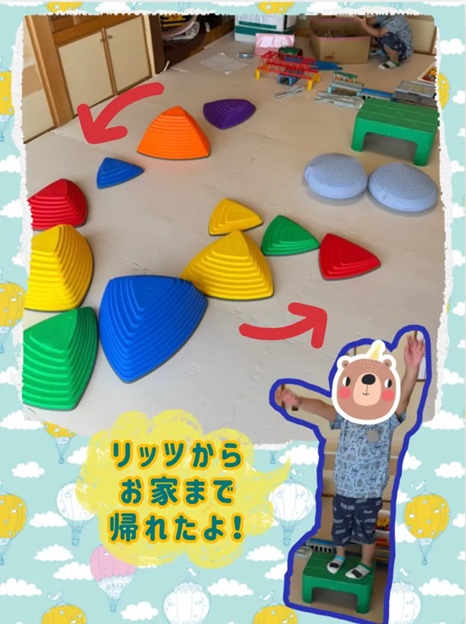 プラレールに夢中になっていたおともだちでしたが、先生が飛び石を並べて道を作っていると、一緒にお手伝いをしてくれました!