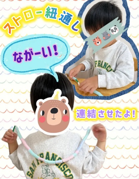この日は、乗り物が大好きなおともだちが、ストローの紐通しに挑戦しました✊