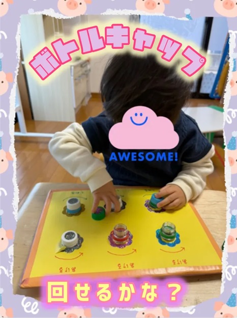 今日は年少さんのおともだちと一緒に、ペットボトルキャップの開け閉めができる手作り教材を使って、手指のトレーニングを行いました💪