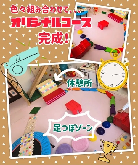 今日も平均台やセンサリーマット、足つぼボールなど様々なものを組み合わせて、オリジナルのコースを作りました🎶