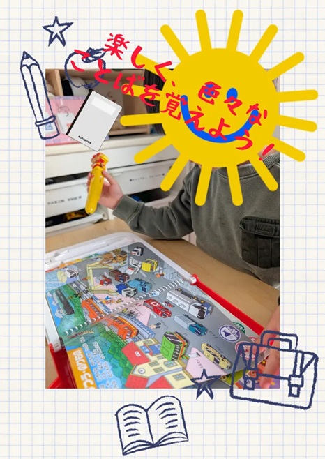 今日は、楽しく、イラストや音からことばを学べることばずかんで遊んでいる様子をご紹介します📔