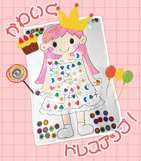 ハートやお星さま、お月さまなどの数種類のパーツを切ってもらい、女の子のワンピースを飾ってもらいました!