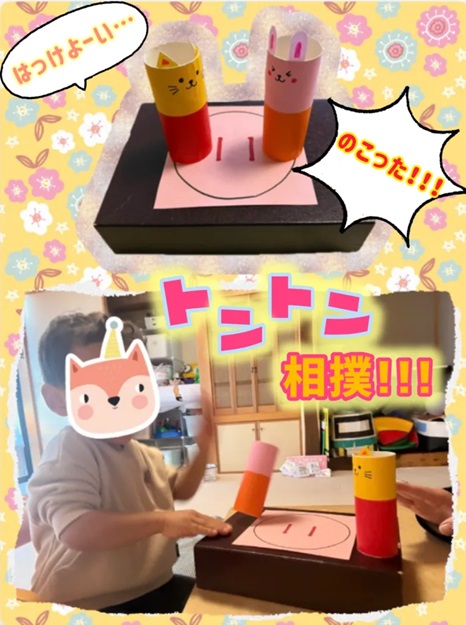 リッツの「トントン相撲」では、トイレットペーパーの芯で作ったお相撲さんに見立てたお人形を、土俵に立たせ、土俵の端をトントンと叩いて相撲をとりました!