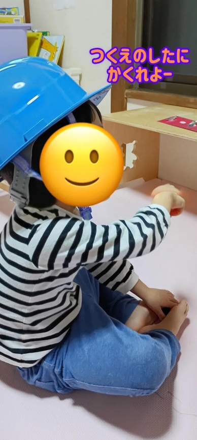 緊急地震速報の音を聞き呆然とするお友達、「あっじしんだ!かくれなきゃ!」と自主的に行動するお友達、何が起きたかわからず遊び続けるお友達・・・色々な顔がみれましたが、皆先生の指示通りに避難することができました。