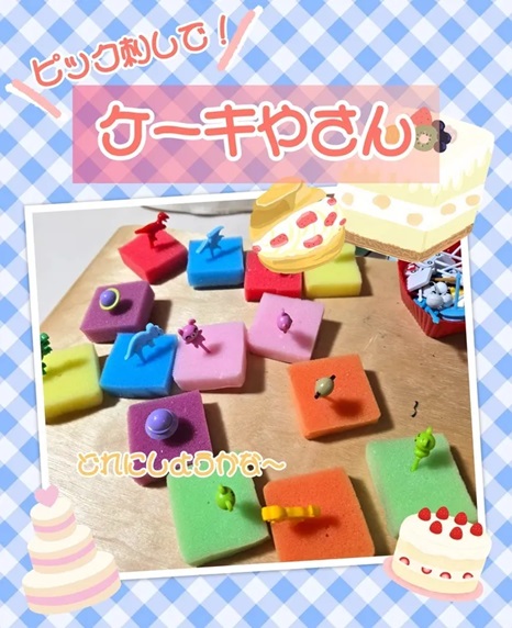 刺し終えたらスポンジをケーキに見立ててケーキ屋さんの開店です🍰