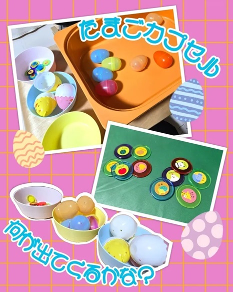たくさんの言葉に触れられるよう、今日はコインとたまごカプセルを使って遊びました🐣【たべもの】と【どうぶつ】、2種類のコインを、たまごカプセルの中に入れます。おともだちには、たまごを開けてもらい、出てきたコインが何だったか、言葉で教えてもらいました🌟