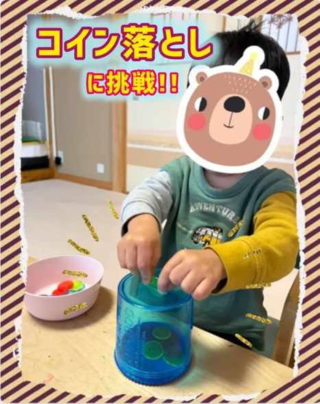 今日は、2歳児さんのおともだちが「コイン落とし」に挑戦している様子を、お伝えしたいと思います📣
