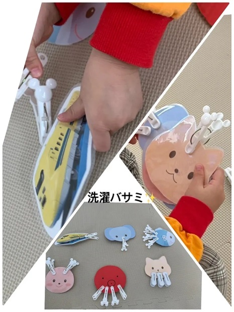 最初は洗濯バサミの硬さに戸惑う様子もありましたが、繰り返すうちに少しずつコツをつかみ、自分で工夫しながら取り組む姿が見られました。