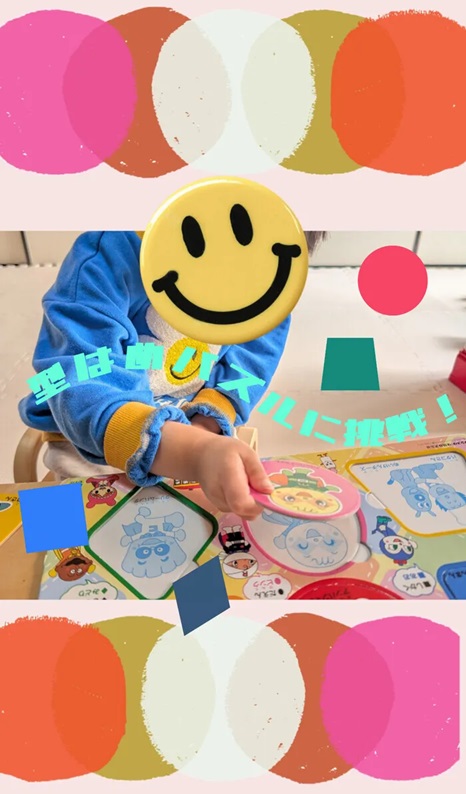 丸・三角・四角・楕円・台形・ひし形の形のパズルを形やキャラクターでマッチングさせながら、型にはめていきました🤗