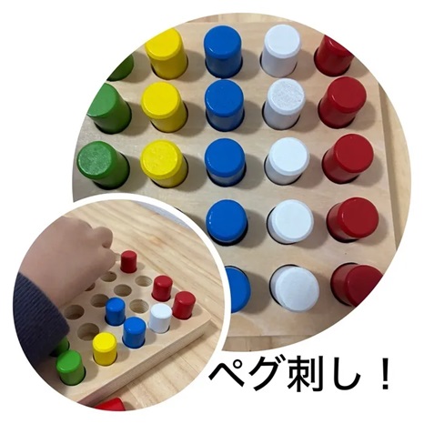 先生が「赤」「青」など色を指定すると、その指示をしっかり聞き取り、同じ色のペグを横に並べることができました。