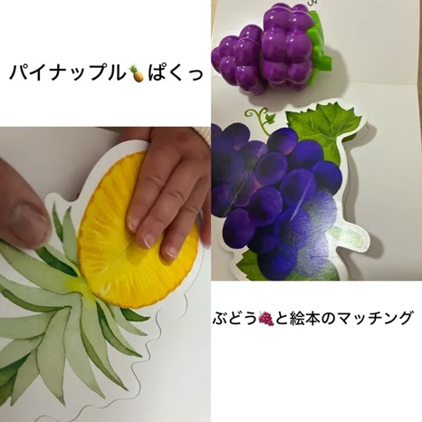 絵本に出てくる果物を見ながら、