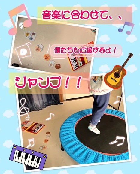 アンパンマンが大好きなお友達は、アンパンマンピアノ絵本で音楽を流しながらトランポリンでジャンプする遊びにドはまり中🤣🤣🤣