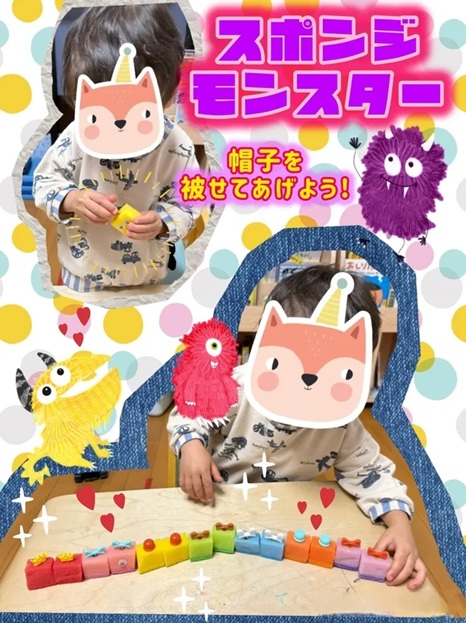 今日は2歳児さんのおともだちが、可愛いスポンジのモンスター達と一緒に、微細運動を楽しみました😊