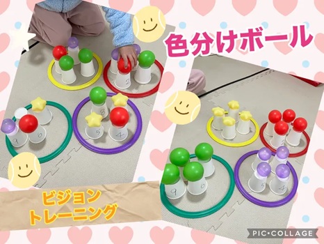 色を見分けることと、紙コップの上にボールを置く動作の両方が必要になります🎶