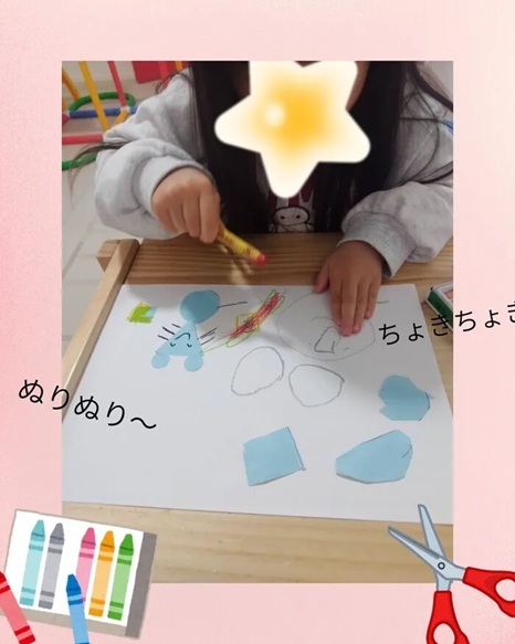 チーズは「カラフルにしたい!」と自分で考え、好きな色を使って楽しく塗る様子も見られました。形を組み合わせて考える力や、見本を見て描く力、自分のイメージを表現する力を楽しみながら育てる活動となりました🎶