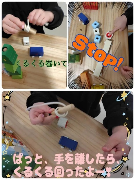 「見て!くるくるする!」と、自分で考えた遊び方を見つけて、夢中になって楽しんでいました✨