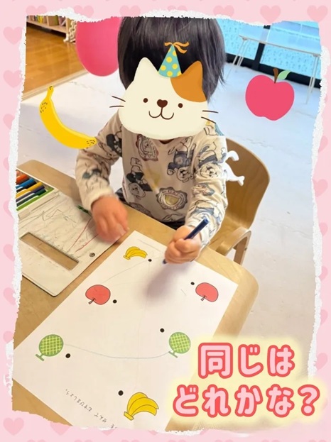 今日は、2歳児さんのおともだちが、同じ物同士をつなぐ課題に取り組みました✊
