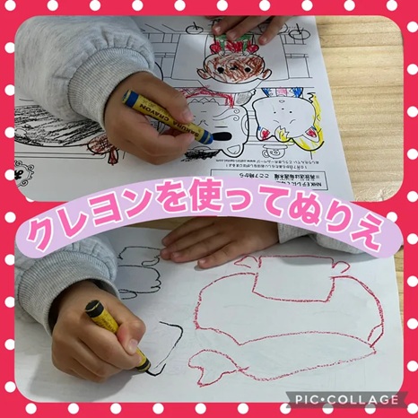 クレヨンを使って塗る動きは、指先の細かなコントロールを必要とし、今後のお箸や鉛筆操作にもつながっていきます✋