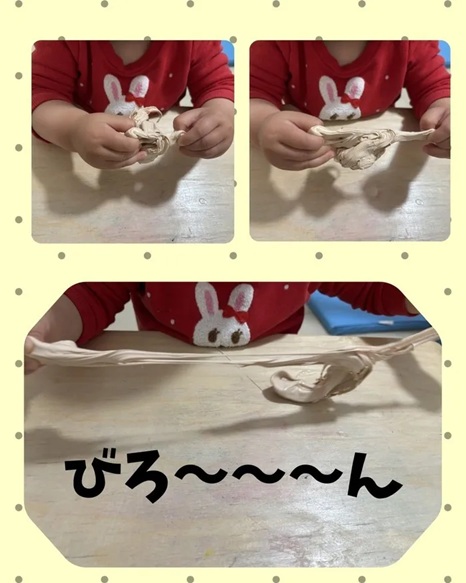 手のひらでぎゅっと握ったり、ゆっくり引っ張って伸ばしたり、「びよーんってなった!」「ちぎれた!」と、さまざまな変化を楽しんでいました🎵
