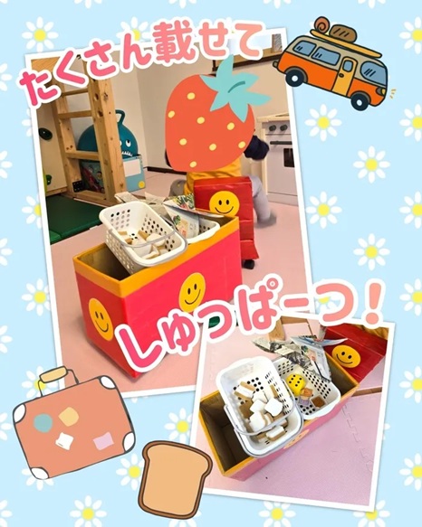 納豆のスクイーズやぬいぐるみ、サイコロなどお気に入りのおもちゃをたくさん載せて、「しゅっぱつしんこうー!」の掛け声に合わせて上手に腕を上げることが出来ました🙋♀️