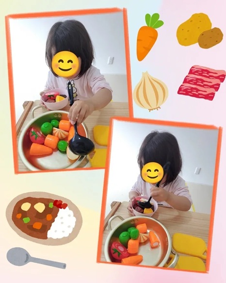 その後、おままごとで実際にカレーライス作りにチャレンジ!シアターで見た動きを思い出しながら、具材を入れたり混ぜたりと、模倣する姿が見られました😊
