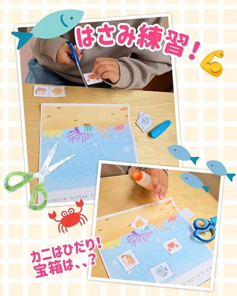 ただ貼るだけではなく、「ハリセンボンは一番下」「上にいるのは~、、、」など、上下左右の位置の確認も一緒に行いました👏👏👏