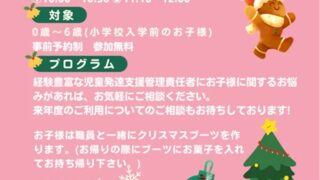 こんにちは!リッツ ジュニア 花です🎅主にまだ療育に通ったことがないお子様向けの体験会&相談会になります。(他事業所と併用したい方も大歓迎です!)生活の中でお子様の何か気になること、お困りごとなどお気軽にご相談ください👂毎日のこと、かんしゃ...